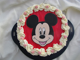 Maalasin Mikin kasvot vaahtistaikinalle ja leikkasin ääriviivoja myöten irti. Sitten tein vaahtokarkkitaikinasta kakkupohjan kokoisen ympyrän, jonka maalasin punaiseksi. Tämän jälkeen annoin maalausten kuivua muutaman päivän ja nostin Mikin kasvot punaiselle pohjalle. Näin kuvan saa hieman nousemaan kakusta.